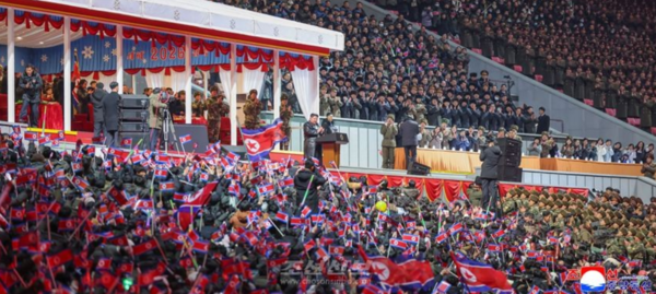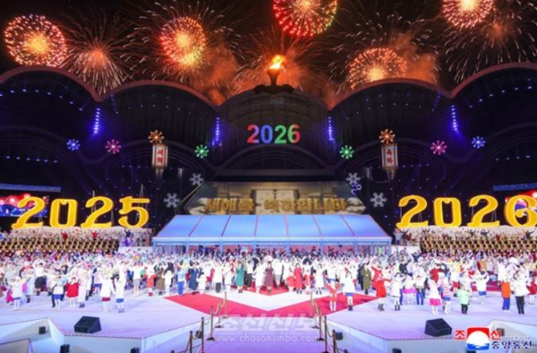 새해 2026년을 맞는 신년경축공연이 평양 5월1일경기장에서 열렸다. 이 자리에서 김정은 조선로동당 총비서가 연설했다고 조선신보가 보도했다.